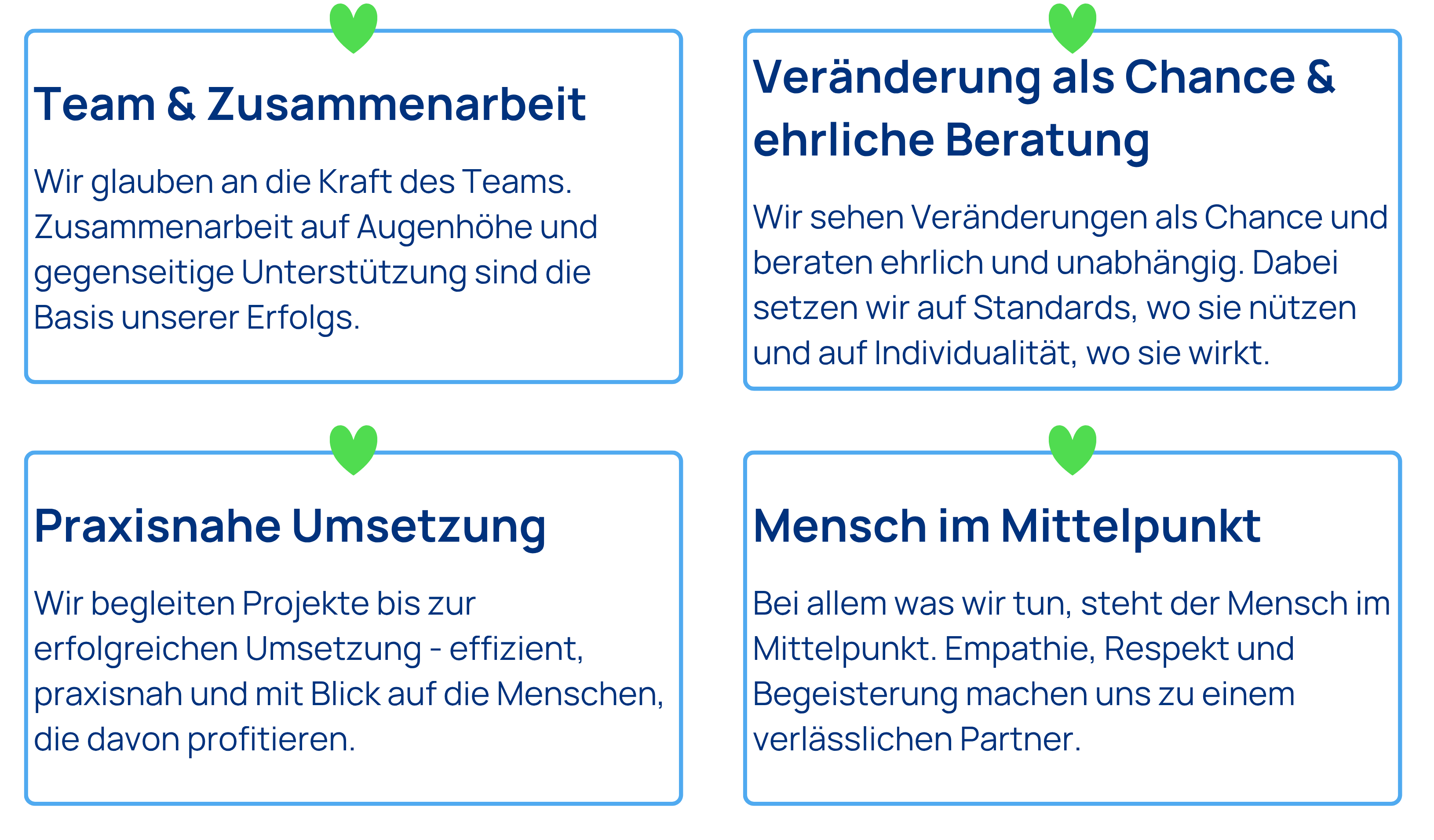 - Wachstum & Weiterentwicklung: Für uns selbst und für unsere Kund:innen.